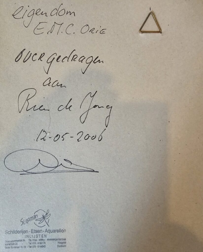 Op de achterkant van de lijst is de volgende tekst geschreven: ‘Eigendom E.M.C. Orie overgedragen aan Rien de Jong 12-05-2006. Voorts is een stempel te zien van lijstenmaker Siepman in Zevenbergschenhoek, Hoogvliet en Dordrecht.