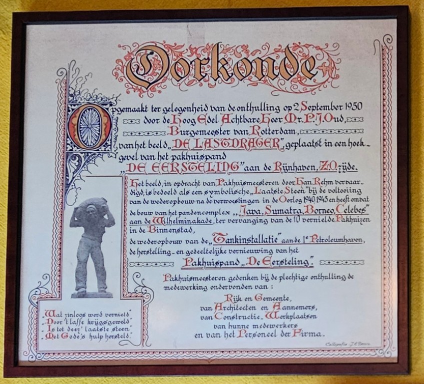 Op 17 april 2025 kwam er een bericht van Janneke met de volgende vraag: ‘Is er maar 1 oorkonde van de Lastdrager of zijn er meerdere?’. Uit de correspondentie die volgde bleek dat Janneke een ingelijst exemplaar van de oorkonde in een kringloopwinkel had gekocht. Aan de hand van de foto die werd meegestuurd kon al direct worden vastgesteld dat het document (met grote waarschijnlijkheid) exact dezelfde omlijsting heeft als de oorkonde die destijds in handen is gekomen van de maker van De Lastdrager, Han Rehm. Janneke was zo vriendelijk om haar oorkonde te schenken aan delastdrager.com, waarvoor veel dank!